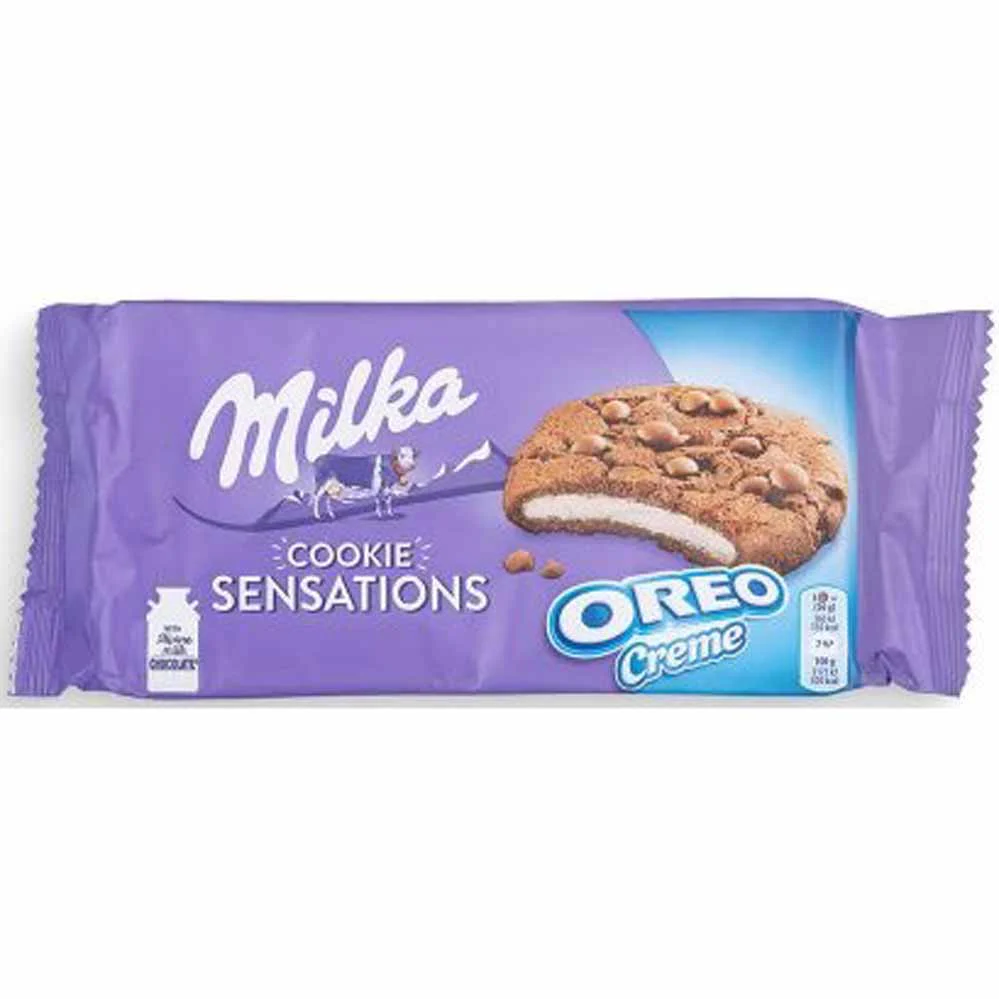 “Milka Sensations Cookies Oreo Cream” is a crispy cookie with original Milka Alpine Milk chocolate chips and a oreo cream filling. A pleasure for all oreo fans.